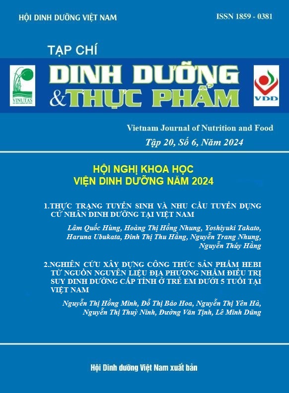 Nguyễn HC, Bùi VT, Nguyễn THT, Nguyễn TT, Nguyễn ĐVA, Bùi TN. TÌNH TRẠNG DINH DƯỠNG, KHẨU PHẦN THỰC TẾ CỦA NGƯỜI LAO ĐỘNG TẠI CÔNG TY CỔ PHẦN THAN NÚI BÉO, THÀNH PHỐ HẠ LONG, TỈNH QUẢNG NINH NĂM 2021. Tạp chí Dinh dưỡng và Thực phẩm. 2024;20(6):141-151. doi:10.56283/1859-0381/807